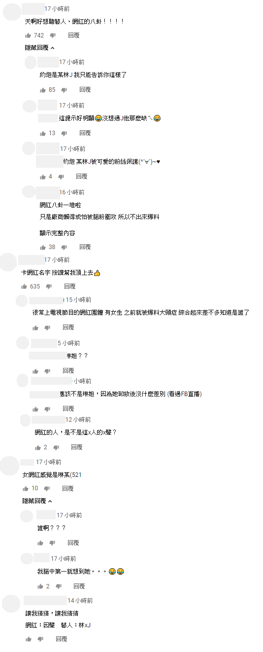 影片上傳後,則有許多網友留言猜測他的爆料對象,第二個男藝人便有許多網友猜測是金曲歌王林俊傑,不過第一個網紅成員網友則提出不同人選,有人猜測是這群人的「茵聲」,更有人猜測是反骨男孩的「琳妲」,然而因為鍾明軒提到卸妝前後差異大,讓網友難以斷定究竟是誰。