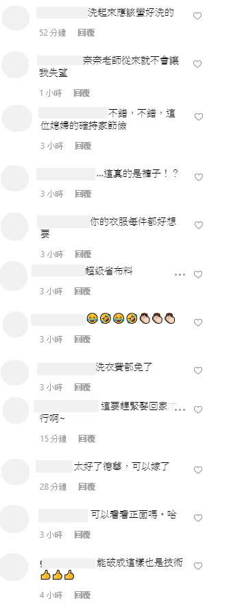 粉絲見狀後,則紛紛留言:「起來應該蠻好洗的」、「奈奈老師從來就不會讓我失望」、「不錯,不錯,這位媳婦的確持家節儉」、「你的衣服每件都好想要」、「超级省布料」、「這要趕緊娶回家才行啊~」、「能破成這樣也是技術」。