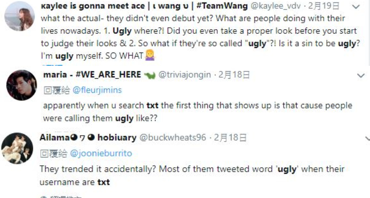 然而有更多網友護航,認為影片燈光和後製都會影響成員外貌,並聲援TXT表示「說他們醜真的很無禮」、「他們都還沒正式出道就開始評論外貌」,另有粉絲提起防彈少年團5年前剛出道時外界的評價,並表示「別忘記BTS剛出道時也被說醜,不過現在已經變得超紅」。