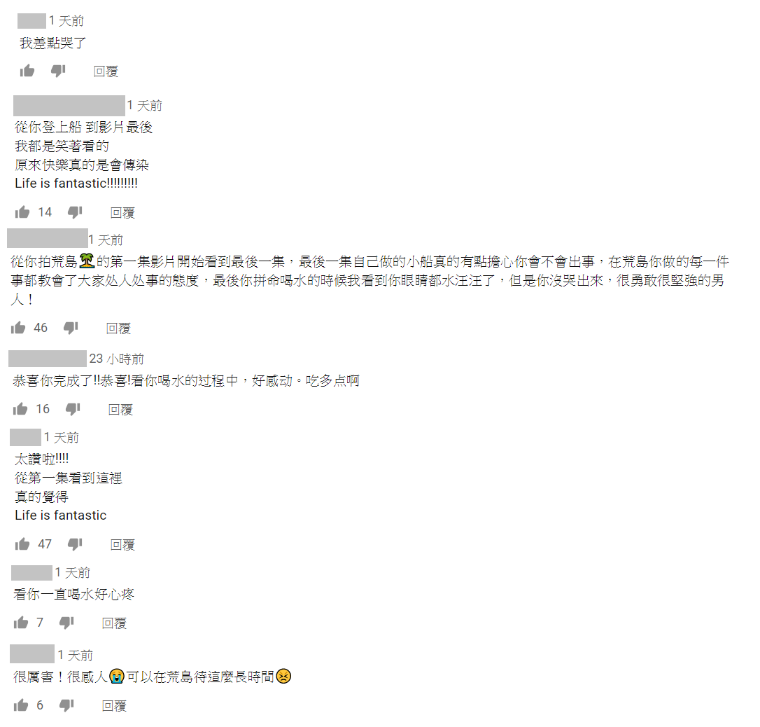 「鋼蛋」的荒島生存挑戰成功,讓網友直呼「我差點哭了」「太讚啦!!!!」「很厲害!很感人」「Life is fantastic!!」「看你一直喝水好心疼」,令在這期間一直追著「荒島生存」系列影片的網友們受到了鼓舞,也更懂得珍惜所擁有的資源和一切。