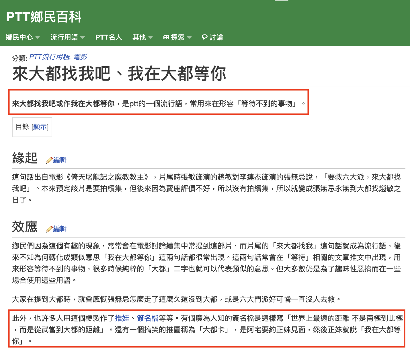 在PTT鄉民百科中也提到「我在大都等你」這句話常用來形容「等待不到的事物」,當大家提到大都時,就會感慨張無忌怎麼走了這麼久還沒到,或是六大門派好可憐一直沒人去救。之後被衍生解釋為「世界上最遠的距離」,甚至還有一個搞笑的梗圖稱為「大都卡」,若是正妹要打槍你時,就會說:我在大都等你,相當搞笑。