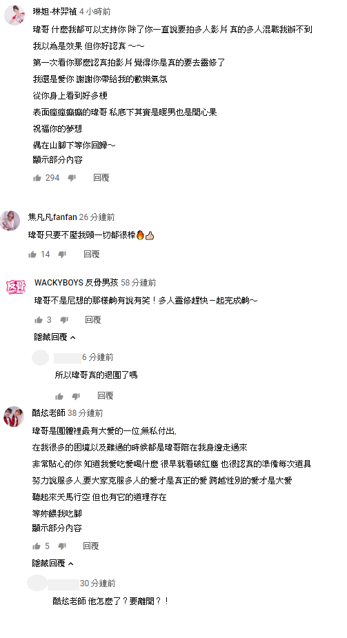 影片發布後,團員們也紛紛來留言,琳妲就震驚的表示原以為瑋哥是做效果,看見瑋哥嚴肅的態度才意識到瑋哥是認真的,她更打上「祝福你的夢想 偶在山腳下等你回歸~」,團長酷炫也在留言處感謝瑋哥一直以來的付出,讓許多網友看了難以接受,頻頻詢問:「瑋哥真的退團嗎」。
