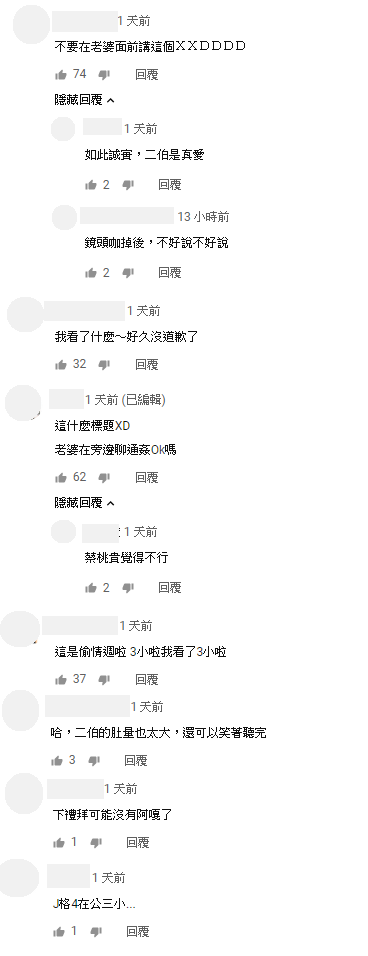 影片播出之後,網友則紛紛留言:「不要在老婆面前講這個XXDDDD」、「我看了什麼~好久沒道歉了」、「這已經不是尷尬可以解釋了…」、「蔡桃貴覺得不行」、「哈,二伯的肚量也太大,還可以笑著聽完」、「二伯要怒了喔~~~~不要亂來」。