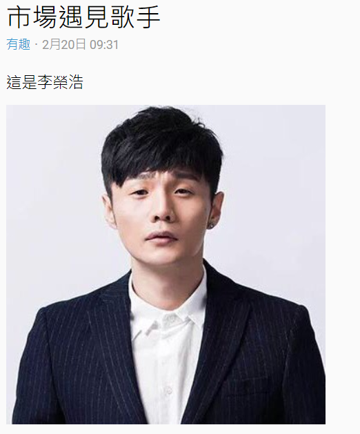日前又有網友在Dcard PO文表示,在北投市場遇見歌手李榮浩,沒想到照片竟然是一隻趴睡在機車坐墊上的小花貓,瞇瞇眼和微張的嘴巴,和李榮浩簡直一模一樣。不僅如此,網友們紛紛貼出各種與李榮浩撞臉的動物,小眼睛的柴犬、快睡著的花豹、瞇瞇眼的小男孩,甚至連黃阿瑪都能撞臉李榮浩。