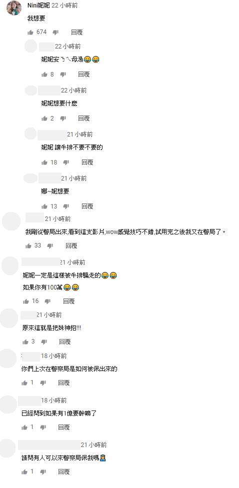 兩人這次的分享依舊充滿幹話,也讓不少網友再次搞笑留言:「我剛從警局出來,看到這支影片,wow感覺技巧不錯,試用完之後我又在警局了」,而也有網友留言大虧牛排:「妮妮一定是這樣被牛排騙走的,如果你有100萬」,而妮妮也親自在影片下方回覆:「我想要」,引起粉絲熱議。