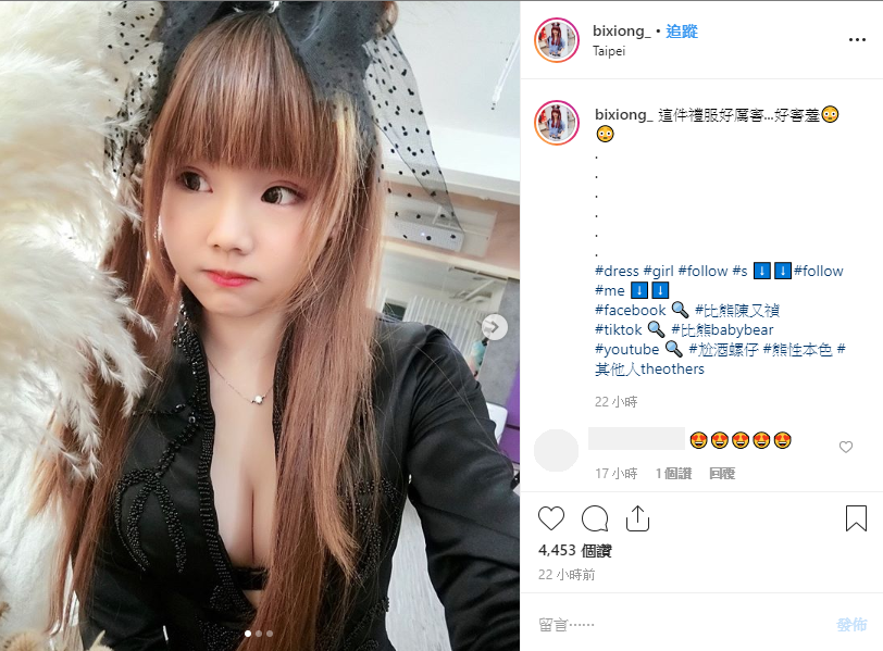 身材姣好的比熊,昨天在IG中放傳一張自己的性感照,只見照片中的她穿著黑色上衣,胸前的深V一路開到腹部,也讓她豐滿的上圍展露出來,超長事業線相當吸睛,而比熊也自己打上:「這件禮服好厲害...好害羞」。