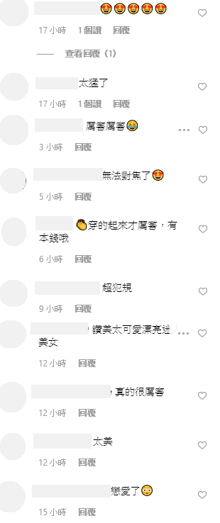 照片上傳後,網友也紛紛留言:「太猛了」、「漂亮的」、「哎唷 我流鼻血了」、「太美了」、「目不轉睛」、「穿的起來才厲害,有本錢哦」、「無法對焦了」、「讚美太可愛漂亮迷人美女」、「太性感了啦!」。