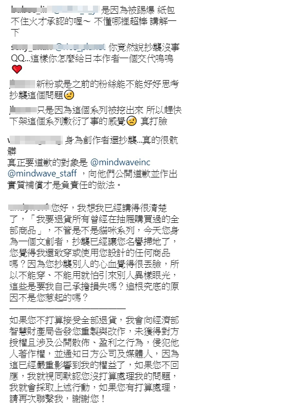 看到抽屜這樣潦草道歉並下架商品的態度,引來許多氣憤的網友前來instagarm上狂轟:「是因為被踢爆 紙包不住火才承認的喔~不懂哪裡超棒 講解一下」、「你竟然說抄襲沒事QQ...這樣你怎麼給日本作者一個交代嗚嗚」、「新粉或是之前的粉絲能不能好好思考抄襲這個問題」、「只是因為這個系列被挖出來 所以趕快下架這個系列敷衍了事的感覺 真打臉」、「身為創作者還抄襲...真的很骯髒 真正要道歉的對象是@mindwaveinc @mindwaveˍstaff,向他們公開道歉並做出實質補償才是負責任的做法」,更有網友氣得要求退貨!
