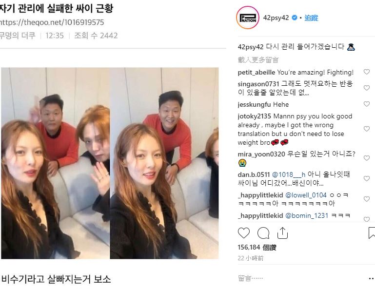 對此,22日,PSY還在個人IG轉分享韓國網友評論他過瘦的照片,更在貼文中表示「會再次進行管理的」,PSY無畏留言甚至轉貼論壇上的評論,讓網友直呼有趣,也貼心提醒PSY說到「真的不要再減肥了」、「應該是第一位因為變瘦被罵的藝人」、「下次出現一定要增胖喔」。