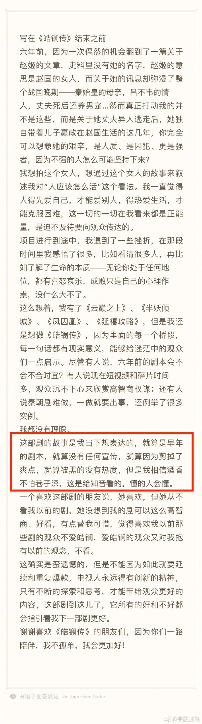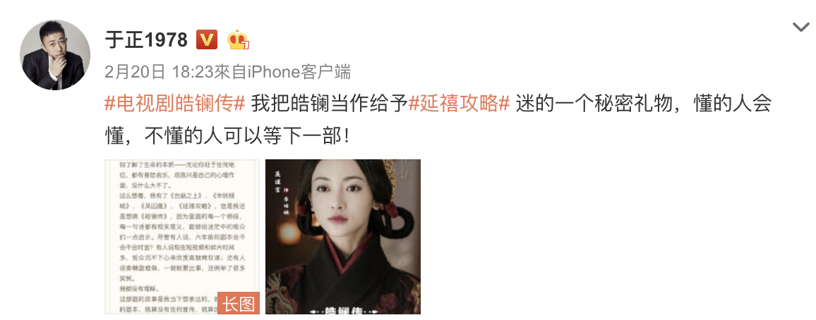 對於大結局,製作人于正在微博發文,「我把皓鑭當作給予《延禧攻略》迷的一個祕密禮物,懂的人會懂,不懂的人可以等下一部!」,附上的長文中也稍稍透露出一些端倪:「就算因為剪掉了爽點,就算被黑的沒有熱度,但是我相信酒香不怕巷子深,這是給知音看的」,但此話一出許多網友仍感到相當傻眼。