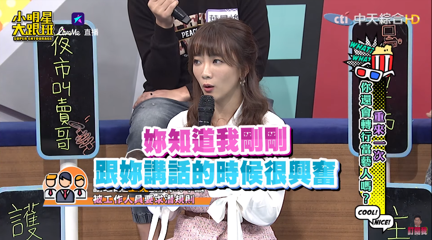 不僅如此,在《黑澀會》時期她也碰過「潛規則」,當時一名雜誌社的男編輯稱自己要幫她介紹工作,便約她一起吃飯,飯局當中對方有意無意的暗示她,演藝圈中很多女星用「潛規則」上位。結束後對方藉口要送她雜誌,邀約他一起去地下室,她也傻傻地跟著去了,沒想到對方把手放在她胸前,還撫摸她身體說:「你身材很好耶~」甚至離開後還傳簡訊給她:「剛剛跟妳聊天我很興奮」,嚇得她趕緊封鎖對方。