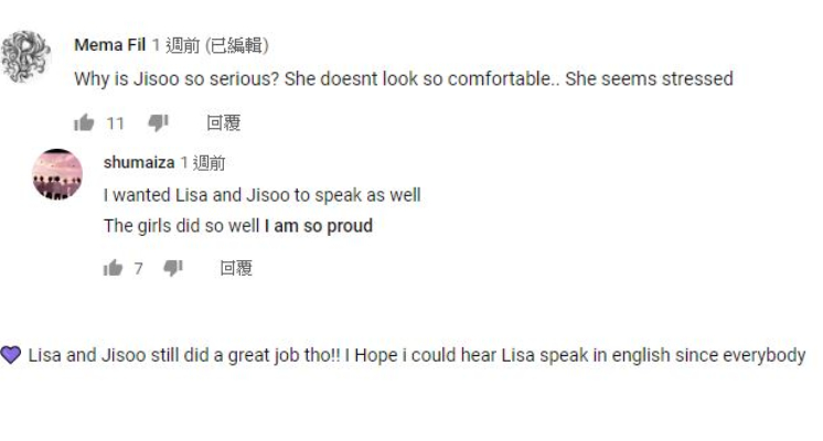 反觀Lisa和Jisoo則多以微笑面對鏡頭或是簡單應答,其中在韓國多是團體發言人的Jisoo也一反常態沉默,當時節目播出時就有不少網友表示「很想聽Lisa和Jisoo說話」。對此在赴美紀錄片中,Jisoo深夜在房間裡向外界略顯無奈表示「如果我會講英文一定會發生更多有趣的事」,接著透漏自己剛到美國時「覺得很害怕」。