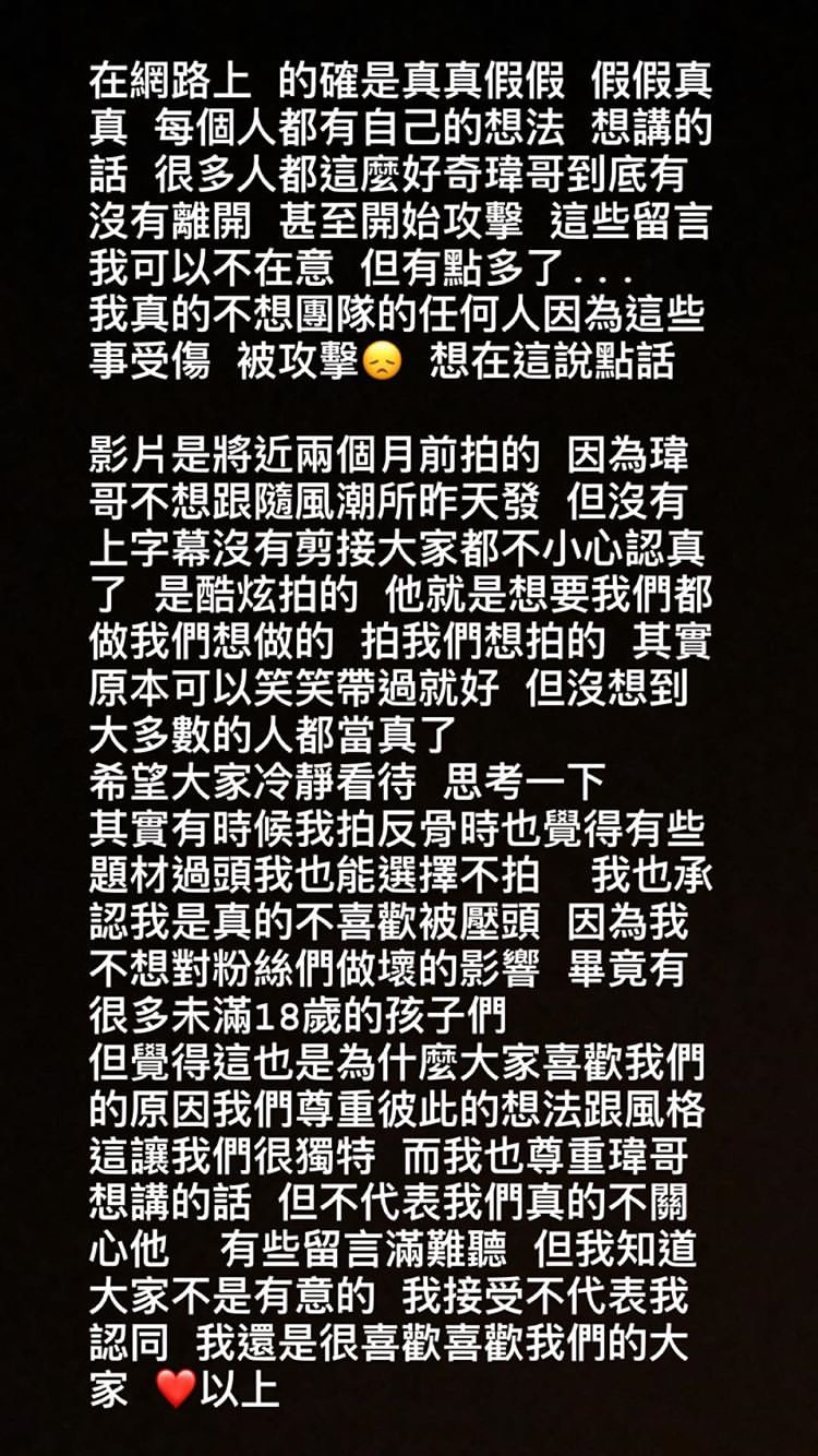 另一方面,凡凡今也用自己的IG回應此事,表示瑋哥的影片是兩個月前由「酷炫」拍攝的,只是當時瑋哥不想跟風,才會到近日才發布。而這支影片發布後也沒有想到很多粉絲都當真,「希望大家冷靜看待,思考一下」,凡凡強調團隊中大家都尊重彼此的想法跟風格,「我也尊重瑋哥想講的話,不代表我不關心他」,希望因此謾罵的粉絲可以消停。