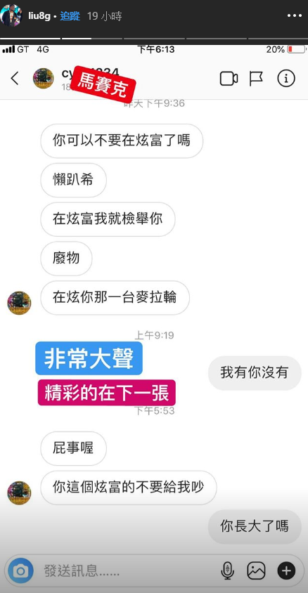 否希昨(22)日在IG限時動態中分享了自己和網友的對話,只見該網友嗆他:「你可以不要再炫覆了嗎?懶X希,再炫富我就檢舉你,廢物,再炫你那一台麥拉倫」,而否希見狀則回應:「我有你沒有」,讓該網友再度惱怒表示:「你這個炫富的不要給我吵」。