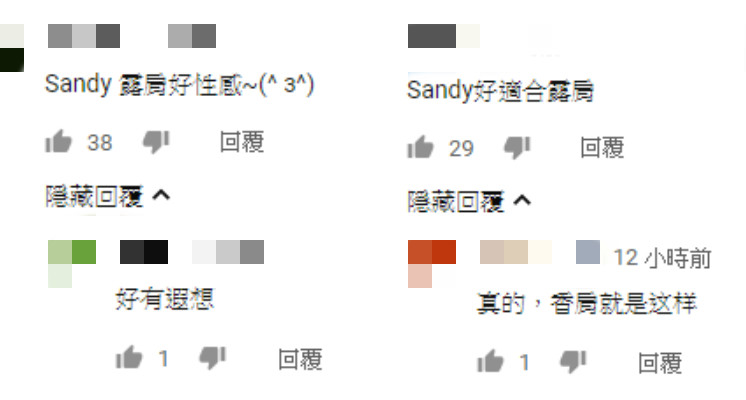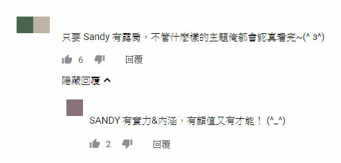 不過網友們紛紛歪樓,把焦點全放在Sandy的香肩上:「Sandy好適合露肩」、「真的,香肩就是這樣」、「真的~好美」、「只要Sandy有露肩,不管甚麼主題我都會認真看完」、「Sandy有實力&內涵,有顏值又有才能」。翻出過去幾集節目,果然只要Sandy穿著「露肩」的打扮,網友們也都是一片好評。