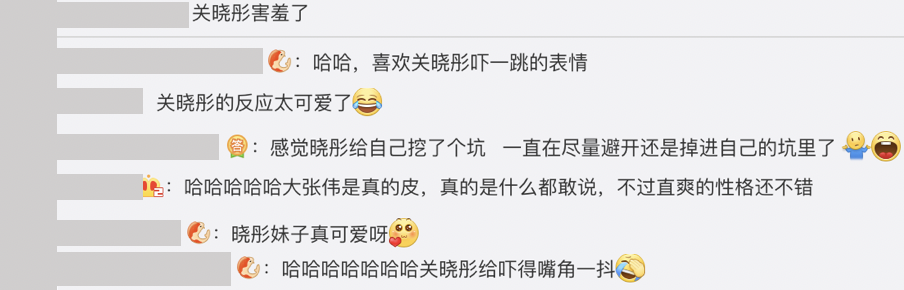節目播出後,也引發網友熱議:「哈哈哈哈哈大張偉是真的皮,真的是什麼都敢說,不過直爽的性格還不錯」、「聽到男友名字,莫名傻笑,好甜啊」、「關曉彤嚇得嘴都抖了一下,好可愛」、「關曉彤害羞了」、「喜歡關曉彤嚇一跳的表情」、「感覺曉彤給自己挖了個坑 一直在盡量避開還是掉進自己的坑里了 」