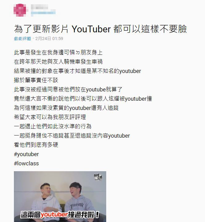 近期台灣論壇「dcard」有網友爆料,一名台灣YouTuber談及「車禍經驗」的影片,其中車禍受害著就是他的朋友,該名網友指控影片中一句「這兩個Youtuber撞過我」非常不妥,為此,他將該支影片截圖上傳到論壇中,並希望外界「不追蹤或退追蹤沒內容Youtuber」。