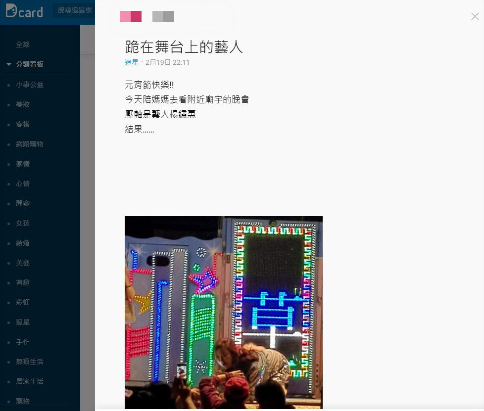 網友在Dcard上寫著,元宵節當天,她陪媽媽去附近的廟宇參加晚會,楊繡惠是壓軸登場的藝人,只是下一秒她卻看到繡惠跪在舞台上,原因竟然只是為了能和台下的粉絲們合照,「平常只看她在節目上毒舌的一面,現在真的很佩服她親民的表現了!」