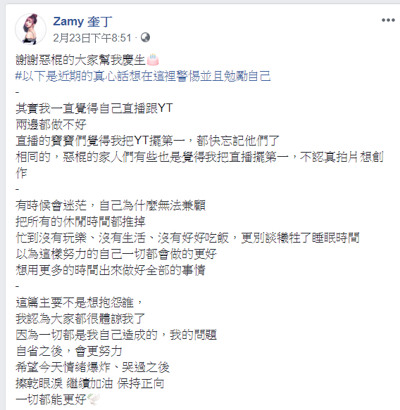 2月23日是奎丁的生日,她也在FB上PO了一張自己臉上被砸刮鬍泡的照片,照片中身上沾著白色泡沫的奎丁看起來仍相當有氣質,但是其實奎丁是想這個機會向大家表達自己從事Youtube頻道後的迷惘,奎丁說到「其實我一直覺得自己直播跟YT兩邊都做不好」,談到直播的粉絲們覺得她把Youtube擺第一,都快忘記他們,而另一方面相同的,惡棍(娛樂)的家人們部分也覺得奎丁把直播擺第一,不認真拍片想創作,對於這樣夾在兩邊的處境,奎丁覺得相當為難。