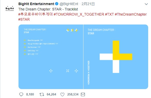 韓國BigHit娛樂公司繼成功推出超人氣男團BTS之後,時隔7年時間再次推出5人男團TXT(TOMORROW X TOGETHER),團名意思是互不相同的你我相遇,攜手共尋One Dream,而在1月中時,隨著官方釋出5人的正臉照和介紹影片,成員們帥氣臉龐也瞬間在網路上製造話題,TXT預計在3月4日推出新專輯和出道Showcase,而出道專輯《The Dream Chapter: STAR》在公開販售短短3天內預購量就突破10萬,在新人當中可說是相當亮眼的成績,今後發展更是令大家期待。