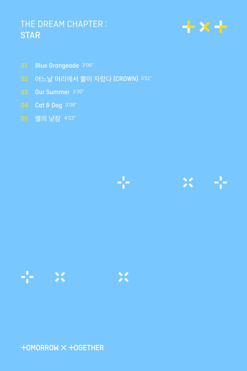 隨著如今TXT新專輯發行日越來越近,BigHit官方twitter也陸續釋出專輯宣傳,不但宣傳照五人的畫面看起來相當俏皮可愛,新專輯《The Dream Chapter: STAR》收錄的五首歌曲名稱也在近日公開,共收錄了「Blue Orangeade」、「CROWN」、「Our Summer」、「Cat&Dog」等五首歌曲,未來正式公開後勢必再度掀起粉絲和網友話題。