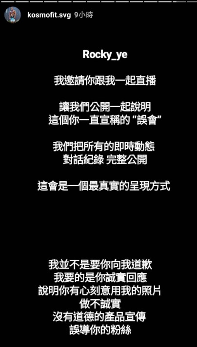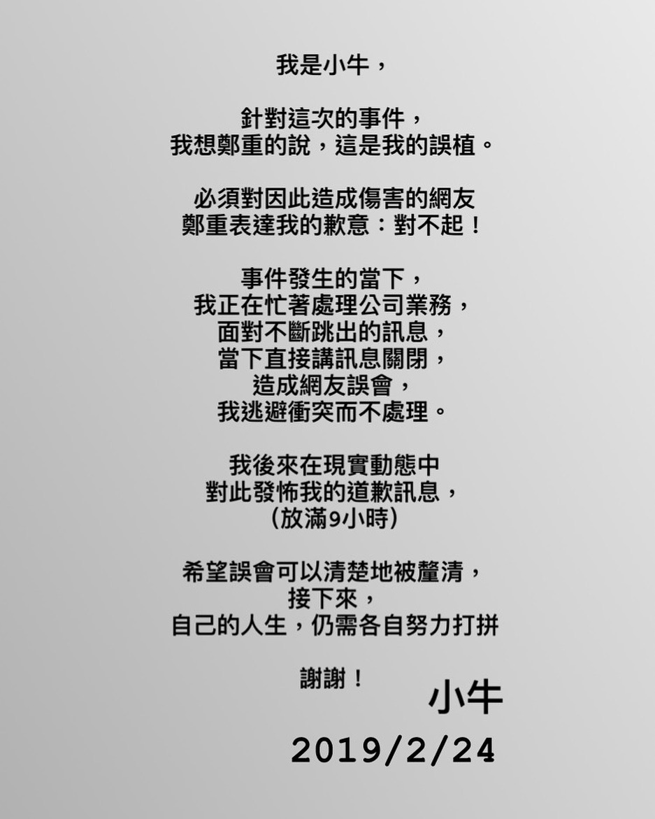 但是事情發展卻出乎被害者「古力」的預料,網紅「小牛」最初不但沒有像對方表示歉意,更是在自己的IG上發現時動態回擊,表示不該出現的言論都將封鎖,更說若有不當的言語就法院見,這也讓網友相當傻眼,身為有錯的一方竟然還擺出如此囂張的態度,而隨著網友不斷抨擊,「小牛」最終出面回應,在限時動態放置道歉文9小時,並對於事件替自己辯護,說自己因為誤植照片,加上事件爆發時忙於業務無即時回應,造成大家的傷害很抱歉。