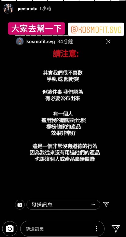 這次事件是由一位在網上自稱「小牛」的健身網紅開始,他擅自使用了同為健身網紅的「古力」的體態對比照,作為自家產品效果良好的證據,但是擅用他人的照片不久就被發現,「古力」在IG上PO現實動態譴責,表示自己和該商品以及該名網紅沒有任何連結,卻無故遭到冒用讓他覺得實在是很沒有道德,而大家也紛紛響應轉發,Peeta葛格也出面聲援。
