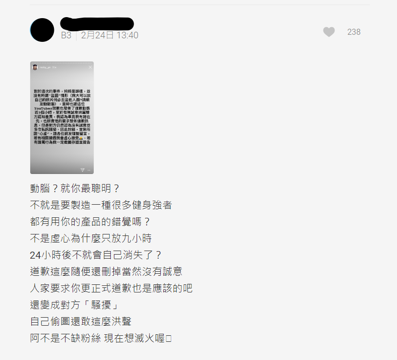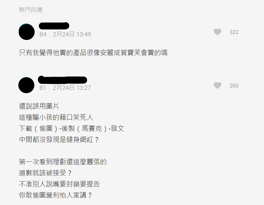 不過網友對於「小牛」的道歉絲毫不領情,怒批說誤用圖片根本就是騙小孩的藉口,從一開始下載、後製並發文,這麼長的時間竟然都沒發現是健身網紅,其他網友也留言表示「第一次看到理虧還這麼囂張的」、「道歉這麼隨便還刪掉當然沒有誠意」、「不是虛心為什麼只放九小時」,「古力」也發動態邀請「小牛」共同出面解釋,只是至今仍未獲得正面回應。