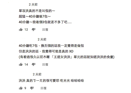 網友看了也直呼「單攻泱不是叫假的 超猛~40分鐘7包」、「看以前木曜就知道泱泱食量!」、「泱泱真的ㄎㄧㄤ的很可愛耶!吃光光。」