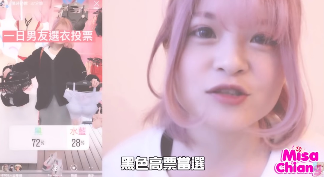 近日,米砂特別在韓國拍攝了新影片中邀請網友們幫他挑選搭配。她挑選了一些衣服,並拍照放在IG上讓網友們挑選她該穿哪件,最後共有超過一萬名網友們參與投票。回到臺灣後,米砂興奮的換上大家為她挑選的服裝,其中,網友們幫她挑選了性感的黑色,她也超大方的直接試穿,並且表示「超過份的,設計整個超辣,聚合度相當好,可以把胸部整個靠攏」讓她大讚「超喜歡」。