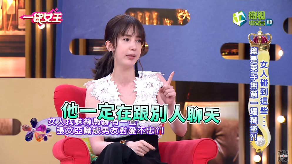 不過,張艾亞透露自己在「抓姦」上相當有一套,直說女生在找蛛絲馬跡的能力勝過於男生。之前有任男友剛交往時整天和她傳訊息,到後來男友上線了卻久久才發訊息給她,讓她察覺有異,於是她開始比對男友的臉書上線時間,甚至去翻了男友最近按讚的對象,還有最近參加了哪些活動等等。