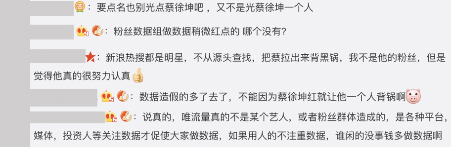 而蔡徐坤被點名之後,粉絲也紛紛出面替偶像打抱不平,留言說道:「粉絲數據組做數據稍微紅點的 哪個沒有?」、「新浪熱搜都是明星,不從源頭查找,把蔡拉出來背黑鍋」、「數據造假的多了去了,不能因為蔡徐坤紅就讓他一個人背鍋啊」,也有另外一些網友感到相當驚訝:「那是蔡徐坤?原來那些數據都是買的啊?」
