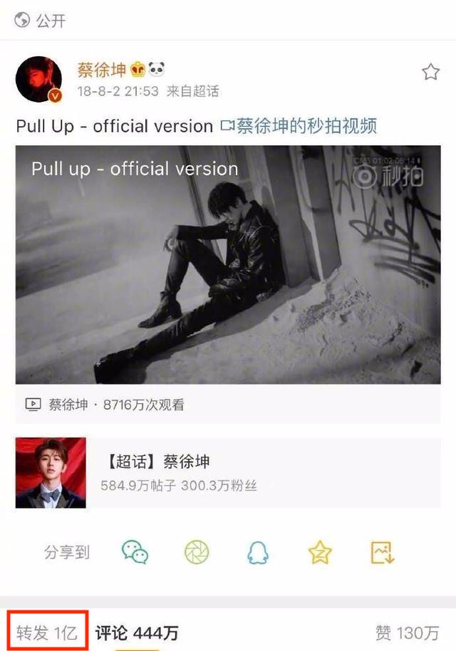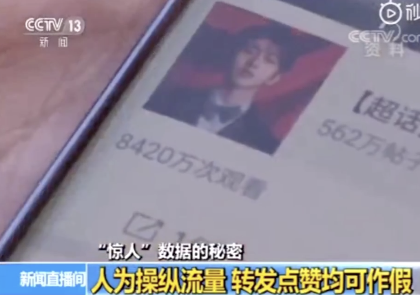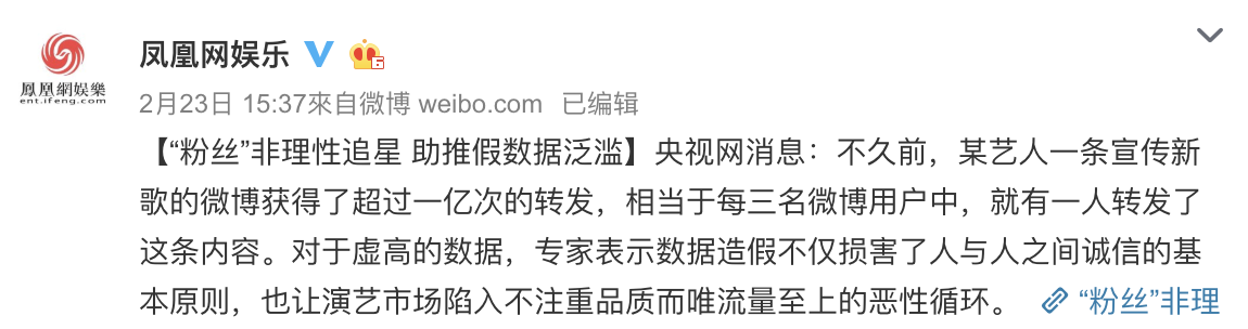 根據央視新聞報導時提到:「不久前,某藝人一條宣傳新歌的微博獲得了超過一億次的轉發,相當於每三名微博用戶中,就有一人轉發了這條內容。對於虛高的數據」,該指稱的藝人即是「蔡徐坤」,他在去年時發布新單曲,上線7天後就突破一億的轉發量,被質疑造假。而專家也表示數據造假不僅損害了人與人之間誠信的基本原則,也讓演藝市場陷入不注重品質而唯流量至上的惡性循環。