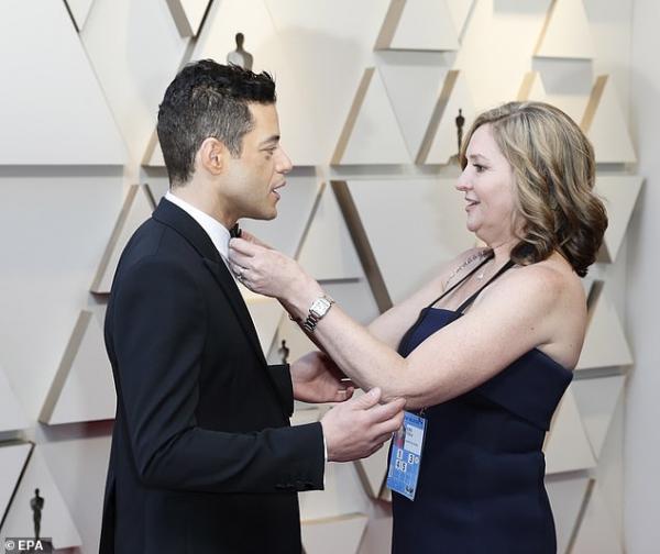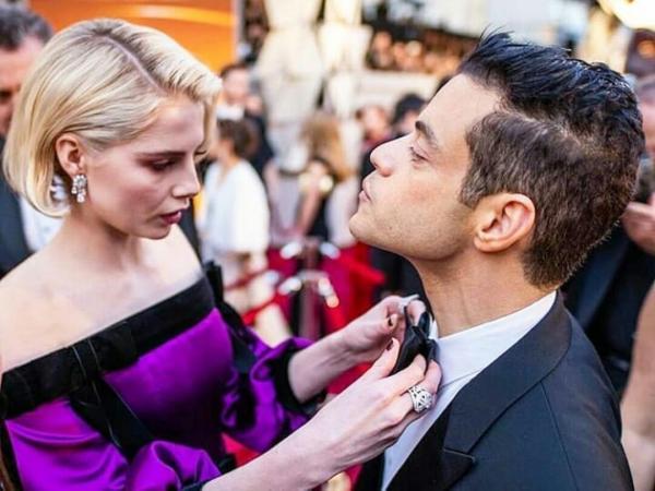 ▼就連雷米馬利克 25 歲的演員女友 Lucy Boynton 在一旁都看不下去,也親自為這位影帝男友調整領結。