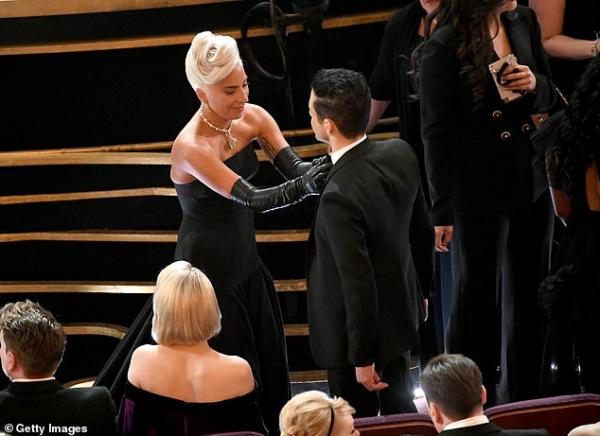 ▼甚至在另外一部音樂電影《一個巨星的誕生》(A Star Is Born)的女主角、樂壇歌后女神卡卡(Lady Gaga)來向雷米馬利克打招呼之時,也按捺不住想要幫雷米馬利克調整領結的心情,事實上雷米馬利克不僅是女神卡卡電影界的前輩,他也比雷米馬利克大上 5 歲,但在這張照片中女神卡卡看起來簡直像是為弟弟操心的大姊姊。