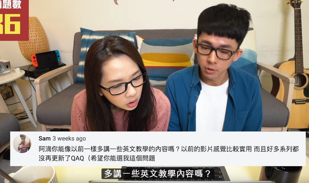 25日,阿滴和滴妹為慶祝「阿滴英文」滿4年終於突破200萬訂閱,並透過影片「200萬訂閱Q&A」隨機抽取觀眾問題回答,其中一名網友問及「你能像以前一樣多講一點英文教學的內容嗎」,該名粉絲認為「以前的影片感覺比較實用,而且好多系列都沒再更新了」。
