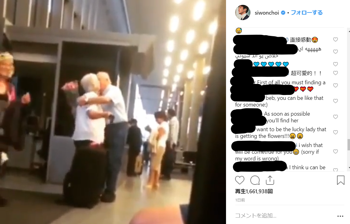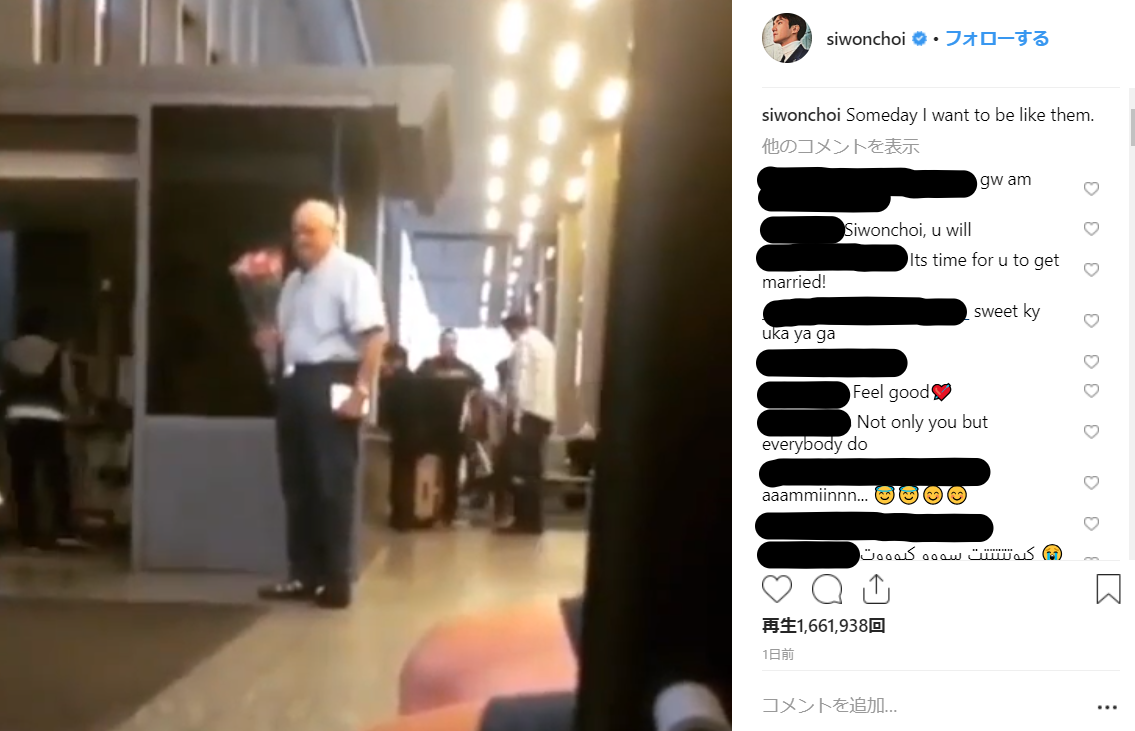 前幾日始源在個人IG上傳一則短影片,並在一旁用英文寫到「Someday I want to be like them」,影片內容是在機場,有一名老爺爺拿著一束花,站在路旁等待回國的妻子,老爺爺看似已經等了許久,身邊不斷穿梭許多行人,但老爺爺始終站在那裡等待,終於老爺爺等到了回國的奶奶,兩人一見面就開心地擁抱在一起並相吻表示愛意,這則影片也被網友推測為是始源心目中理想的夫妻類型。