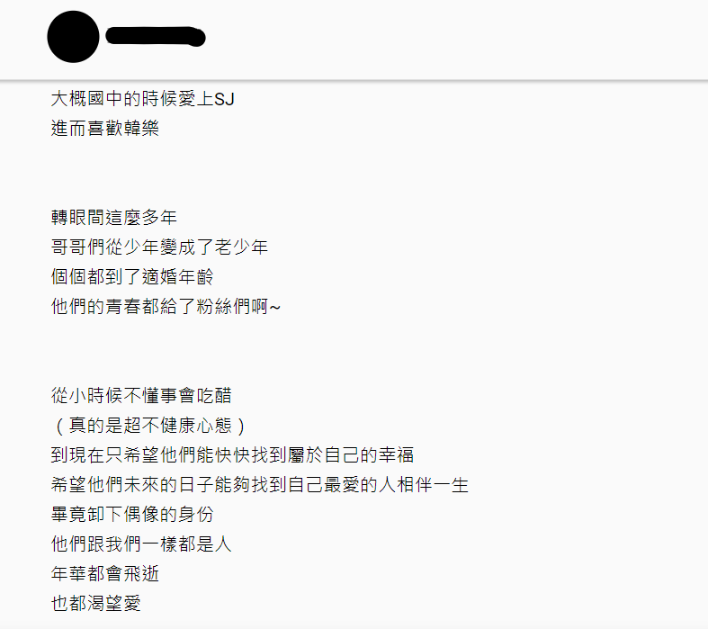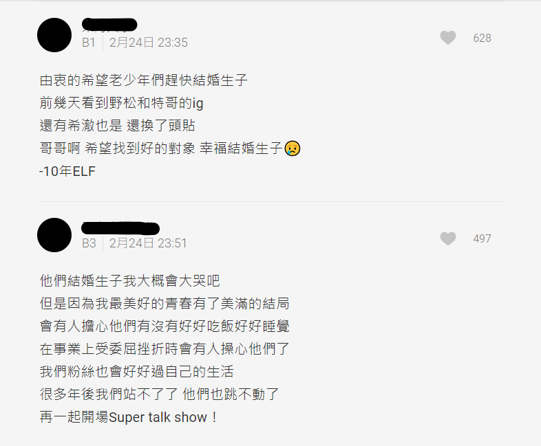 看完始源分享的短片也讓粉絲們看了相當感動,留言表示看起來真的好甜蜜,而粉絲也回想起當初開始喜歡Super Junior時,成員們都還是青澀的少年,隨著時間流逝來到今天也成為適婚年齡的年紀,有粉絲向始源說出內心話告白,表示「以前不懂事會吃醋,到現在只希望他們能快快找到屬於自己的幸福,希望他們未來的日子能夠找到自己最愛的人相伴一生」,並解釋「他們跟我們一樣都是人,年華都會飛逝,也都渴望愛」粉絲也紛紛留言至上對偶像的祝福。