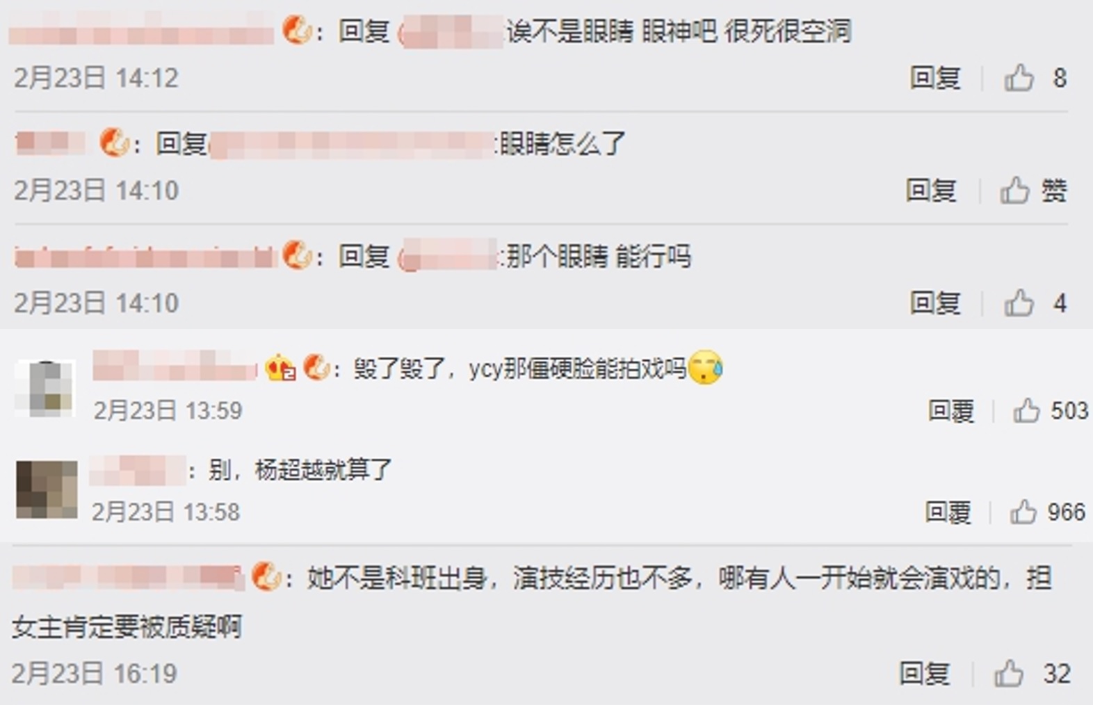 此消息一出,許多網友都覺得很滿意男主的選角,對王鶴棣幾乎是好評居多,但反觀女主角楊超越的部分可就不一樣了,大多數人都認為十分不妥,有網友認為她的臉部表情太僵硬,或者眼神太空洞,甚至有人直言:「毀了毀了,楊超越那僵硬臉能拍戲嗎」、「別!楊超越就算了」,也有比較理性的網友則是說:「她不是演藝科班出身,演技經歷也不多,哪有人一開始就會演戲的,擔女主角肯定要被質疑啊」。