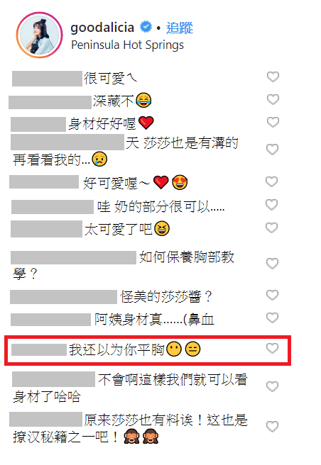 照片PO出後,網友們除了對於小男孩和小木桶池的關心外,引起最多討論的便是過去曾在IG上發文說「不敢穿比基尼」的「愛莉莎莎」,這次卻大方選擇穿「比基尼」展現自己的姣好身材,也讓大家紛紛表示「身材很好欸」「天 莎莎也是有溝的 再看看我的...」「阿姨身材真……(鼻血)」「如何保養胸部教學?」「原来莎莎也有料欸!這也是撩漢秘籍之一吧!」,更有網友直白坦言「我還以為你平胸」。