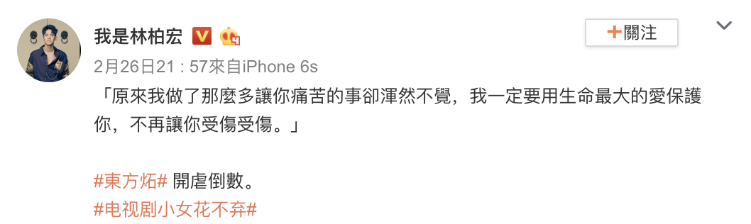 大陸現今最夯的古裝劇《小女花不棄》前三天的收視率打破《延禧攻略》的紀錄,如今劇情進入白熱化,許多橋段都讓觀眾看得很揪心,而林柏宏在26號晚上發出一則貼文,預告了接下來的劇情,讓粉絲相當虐心。