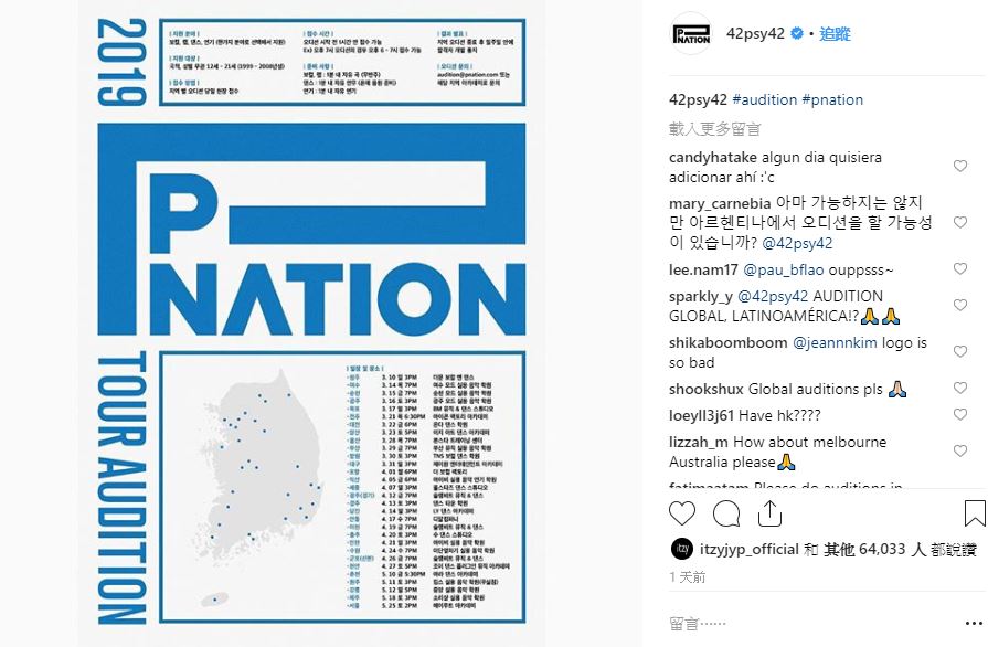 目前P nation正積極招募練習生,26日,Psy也在個人IG分享全國試鏡訊息,預計會從3月開始展開為期三個月的巡迴。此外,海報中也提出限定1999年到2008年出生的未成年人參與,期待找到演戲、唱歌或是跳舞的新星。