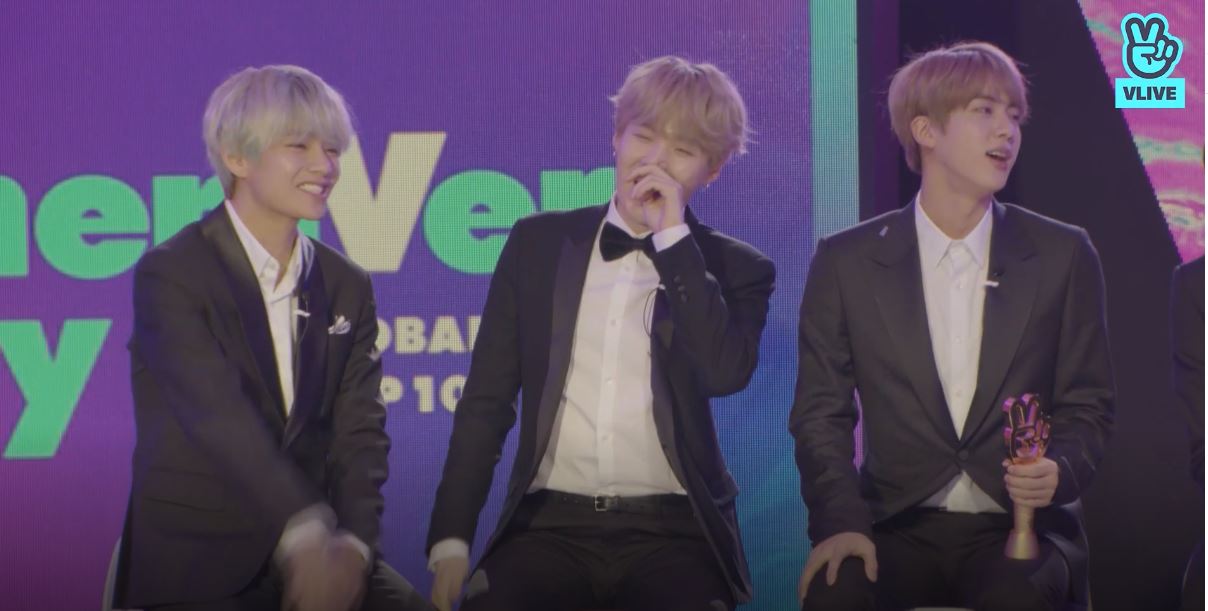 韓國三代男團「防彈少年團」由JIN(金碩珍)、SUGA(閔玧其)、J-HOPE(鄭號錫)、RM(金南俊)、JIMIN(朴智旻)、V(金泰亨)以及田柾國所組成,七人不斷締造佳績,於去年所推出的新專輯,更是二度打入美國Billboard告示牌200大唱片,可說是名符其實的「世界彈」,團隊雖曾遇低潮,但他們為了粉絲「阿米」和團員一同振作,決心繼續努力,而近日他們登上了V LIVE所舉辦「年度TOP10」的節目錄製,與粉絲們共同慶祝,而影片也於本週播映完畢。