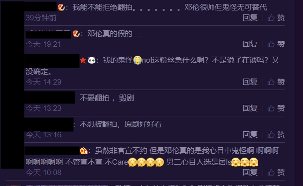 消息曝光後,網友們紛紛留言「我能不能拒絕翻拍。。。。。。。鄧倫很帥但鬼怪無可替代」、「鄧倫真的假的.....」、「不要翻拍 ,毀劇」、「不想被翻拍,原劇好好看」、「這粉絲急什麼啊?不是說了在談嗎?又沒確定。」、「劇情肯定改得亂七八糟」、「只求別毀劇」希望經典別被毀掉,但也有網友表示「鄧倫那個如果是真的就開始期待了」、「雖然非官宣不約 但是鄧倫真的是我心目中鬼怪啊」相當期待成品出爐!