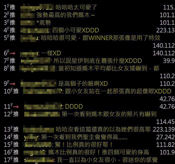 不只韓國論壇上的網友們超有感,台灣的網友們也在PPT上瘋狂討論:「哈哈哈太可愛了」、「氣勢最高我們媽木」、「四個小可愛XDDD」、「哈哈哈很可愛,跟WINNER那張像是用了特效一樣」、「所以說星伊到底在囂張什麼XDDD」、「當初知道媽木平均都比女友矮嚇到,都是高個子的臉啊XD」、「跟小女友站在一起那張真的超傻眼XDDD」等等...