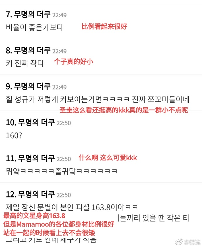 不過當氣勢女團,和其他家藝人們(包含:朱利安·姜、INFINITE 聖圭、SEVENTEEN 珉奎、防彈少年團 V, J-hope、Winner) 站一塊的時候,她們卻意外地像是被照了縮小燈的一樣,每個人都變得超嬌小,有種加了特效的感覺,氣勢方面當然也被迷你化了,對比隔壁家的清新女團,有著小女友之稱的GFriend,身高卻意外都比MAMAMOO高。