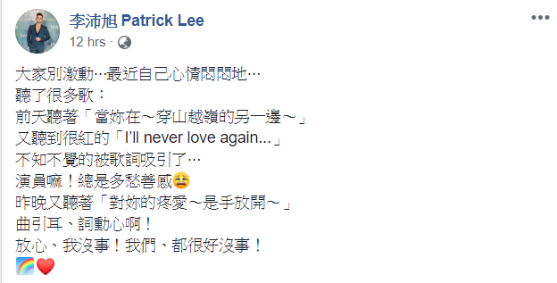只是事隔不到7小時,李沛旭又再度將貼文刪除,且用同張照片要大家別激動,強調只是最近心情沉悶,聽了幾首歌被影響,「演員嘛!總是多愁善感」,最後強調「放心、我沒事!我們、都很好沒事!」來來回回幾次分手傳言又突然來個大逆轉,讓外界越看越不懂,兩人感情究竟如何,恐怕也只有當事人明白。