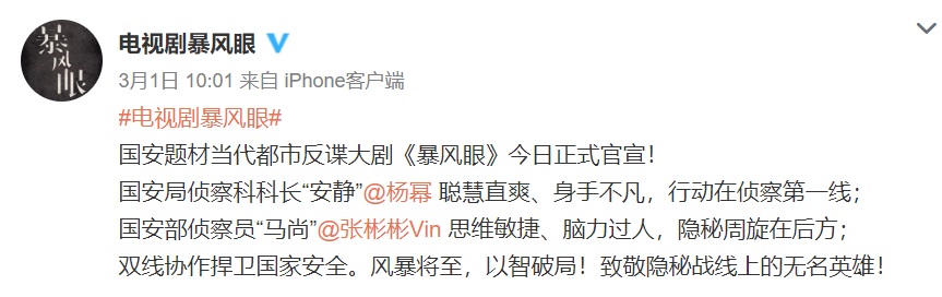 在昨日電視劇正式宣布演員名單,楊冪將搭檔古裝男神「張彬彬」演出新劇《暴風眼》,這次她在新戲中扮演國安局偵查科科長「安靜」,張彬彬則是偵查員,故事以隱密調查國安級事件為主,這也是楊冪首度接觸的新題材,甚至還要練武打動作,對楊冪而言是全新的挑戰,粉絲們也紛紛直呼:「超期待!」