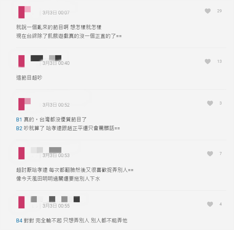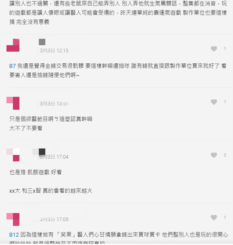 其他網友們也痛批:「就說一個亂來的節目啊!想怎樣就怎樣」、「現在台綜除了飢餓遊戲真的沒一個正直的了= =」甚至傻眼爆料,抽球橋段經常使用「金錢交易」,把單純靠運氣的遊戲變得很骯髒,「要這樣幹嘛還抽球,誰有錢就直接跟製作單位買來就好了。」