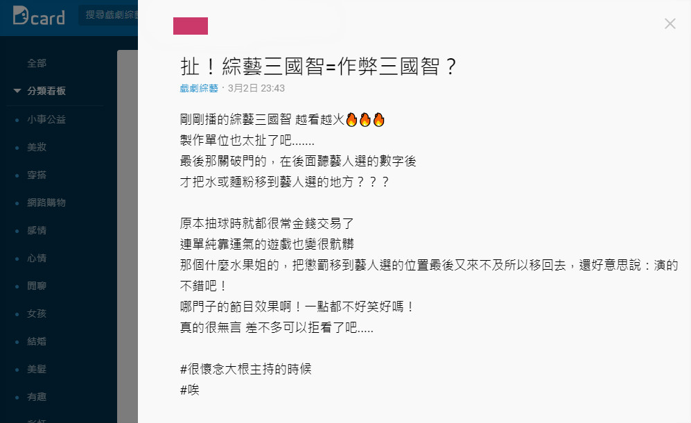 實境外景節目《綜藝三國智》由納豆、王少偉、張立東、鯰魚哥等人共同主持,不過近日卻有網友在Dcard質疑「綜藝三國智=作弊三國智?」直說製作單位聽到藝人的選擇後,才開始擺放懲罰的位置,憤怒直說「哪門子的節目效果啊!一點都不好笑好嘛!」,甚至揚言拒看,網友們紛紛表示「越看越火大!」